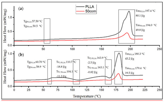 The Tm drops between the first and the second heating for both PLLA sample and the composites. The 25com composite has a Tm close to the pure PLLA sample. For a composite with a high content of HAP NPs, i.e., 50com and 75com, the melting temperature (Tm) drops to 194 °C during the first heating (for pure PLLA sample it is 197.4 °C). Tm after second heating is almost the same for all samples. Figure 8 shows the comparison of the curves for PLLA sample and 50com samples after the first and second heating. The temperature shifts of Tg, Tc, and Tm, as well as the enthalpy value, change. Changes in the area under the Tm and Tc peaks can be observed; as the amount of HAP NPs increases, the enthalpies of melting and crystallization decrease.