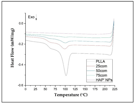 In our study, the DSC was evaluated in three steps: heating (first heating), cooling, and second heating for warm isostatic pressed PLLA and HAP NPs samples and composites. Figure 7 presents DSC curves for the 25com, 50com, and 75com composites, as well as HAP NP and PLLA samples, after the first and second heating. The DSC curve of the pure PLLA sample shows a glass transition temperature (Tg), cold crystallization temperatures (Tc), melting temperature (Tm), crystallization, and melting enthalpies. The DSC signals of the 25com, 50com, and 75com composites are similar. The curve for the HAP NPs sample shows changes associated with evaporation of water from the particle surface, visible only in the first heating but no characteristic temperatures in the second heating. All changes recorded in the composites originate from PLLA phase, because the HAP NPs in the temperature range studied are stable.