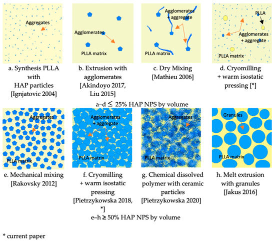 - Pietrzykowska, E.; Mukhovskyi, R.; Chodara, A.; Wojnarowicz, J.; Koltsov, I.; Chudoba, T.; Łojkowski, W. Composites of polylactide and nano-hydroxyapatite created by cryomilling and warm isostatic pressing for bone implants applications. Mater. Lett. 2018, 236, 625–628. [Google Scholar] [CrossRef]