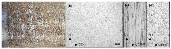 Figure 1. Microstructure morphology of CSP process Fe-0.65%Si non-oriented electrical steel billet (a), hot rolled band (b), cold rolled sheet (c) and annealed sheet (d).