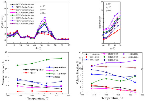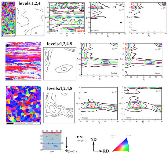 As shown in Figure 2 and Figure 3, textures in thickness of hot-rolled band are quite different, and a strong Goss texture is dispersed in the surface. Textures in 1/4-order surface layer are mainly α, γ-fiber texture and rotating-cube texture, and textures in the center layer mainly have a rotating-cube texture. Columnar crystals in continuous casting billet are well developed (as shown in Figure 1a), and columnar crystals would be compressed during the hot rolling process. Columnar crystals with the original orientation of <100> would rotate around the ND direction and deviate to the rotating cube orientation. Therefore, a certain intensity of rotating-cube texture would form during the hot rolling process. Finite element simulation study on crystal plastic deformation shows that the rotation behavior of columnar crystals with <100> orientation mainly depend on the accuracy of orientation. {100} orientation with 10° ≤ Δφ1 ≤ 20° and 0° ≤ ΔΦ ≤ 5° would be more inclined to rotate toward {001}<120>, and those with 10° ≤ Δφ1 ≤ 20° and 10° ≤ ΔΦ ≤ 15° would be more inclined to rotate toward {411}<148> during the rolling process [41]. Meanwhile, due to dynamic recrystallization during the hot rolling process, Goss (surface layer), γ and α-fiber textures would form [1,2,3], thus forming a texture distribution in the thickness direction of the hot-rolled band.