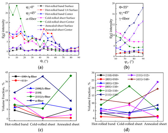 Figure 3. Orientation line distribution of α, γ textures and volume fraction distribution of textures of Fe-0.65%Si non-oriented electrical steel. (a) α textures, (b) γ textures, (c) and (d) volume fraction distribution of textures.