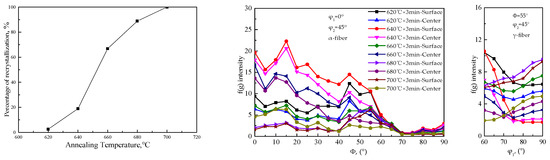 Figure 4 and Figure 5 show the microstructure of the recrystallization process, variation of recrystallization percentage with annealing temperature, and the distribution of α and γ orientation lines, respectively. Cold-rolled sheet of Fe-0.65%Si non-oriented electrical steel would recrystallize at 620 °C and would be complete at 700 °C. As the recrystallization progresses, new grains nucleate along the shear band and gradually grow up. After complete recrystallization, the distribution of new grains at a specific angle to the rolling direction at the initial stage of recrystallization gradually disappears, and the microstructure is a regular ferrite microstructure.
