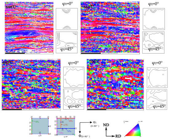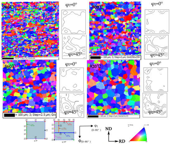 Figure 6. EBSD inverse pole figure (IPF) maps, φ2 = 0° and φ2 = 45° ODF of Fe-0.65%Si non-oriented electrical steel in the recrystallization process (levels: 1,2,4,8; deviation angle 15°).