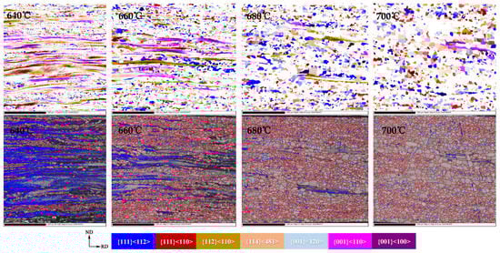 Figure 8 shows the texture composition and grain boundary distribution of the CSP process non-oriented electrical steel during recrystallization. At the initial stage of recrystallization (640 °C), the recrystallized grains of α and γ-fiber texture first nucleate in the shear zone. As the energy storage of deformed grains in the {111}<112> orientation is higher than that in {111}<110> and {112}<110>, γ-fiber texture would nucleate in the shear band before α-fiber texture. Cubic-oriented and Goss-oriented grains also nucleate in the shear zone first, but the nucleation is not uniform and is relatively scattered. The main nucleation is in {001}<110>, { 112}<110>, {111}<110> and {111}<112> orientation-deformed grains. As {100}<011> has high content but low deformation energy, part of the {100}<011> texture would retain by in-situ recrystallization during annealing. Because of nucleation sites advantage of α*-fiber texture recrystallized grains, they would nucleate and grow mainly in the deformed tissue of α-fiber texture ({100}<011>~{112}< 011>).