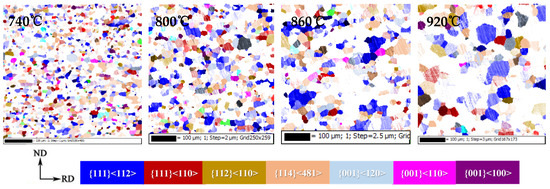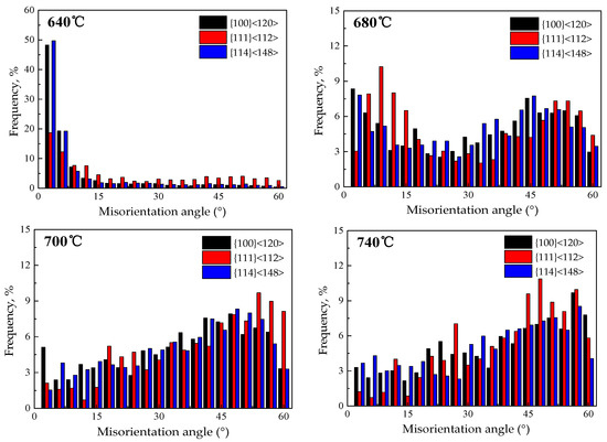 According to the statistics of the grain boundary angle of the grains along the thickness direction after annealing at 740–920 °C, it was found that the large-angle grain boundary accounts for 73%–81%, and the small-angle grain boundary does not appear to be concentrated in a specific orientation grain trend. It is generally considered that the large-angle grain boundary with an orientation difference of more than 15° and less than 45° with the adjacent grains is a high-mobility grain boundary, and the recrystallization stages of the grains with a large-angle grain boundary are basically completed.