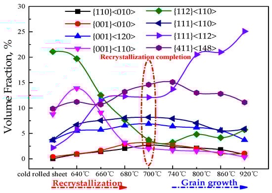 Figure 12. Variation trend of main texture components content in recrystallization and grain growth process of CSP process Fe-0.65%Si non-oriented electrical steel annealed sheets.