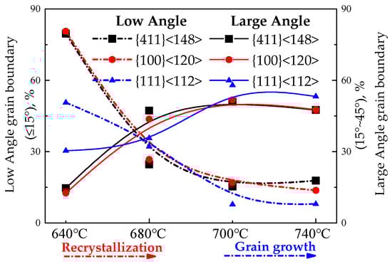 Annealing at 640 °C, {111}<112> oriented grains with low-angle grain boundaries between adjacent grains (orientation difference with adjacent grains less than 15°) account for 50.64%, the ratio of low-angle grain boundaries between oriented grains and adjacent grains of {411}<148> and {100}<120> are 79.66% and 80.6%, respectively. {411}<148> and {100}<120> oriented grains account for 14.65% and 12.6% of high mobility grain boundaries (the difference in orientation with adjacent grains is greater than 15° and less than 45° grain boundaries), respectively; {111}<112> oriented grains accounted for 30.37% of high mobility grain boundaries. Therefore, in the early stage of recrystallization, {111}<112> texture precedes {411}<148> and {100}<120> textures to recrystallize. With the progress of recrystallization, the ratio of {411}<148> and {100}<120> recrystallization texture is greater than {111}<112> orientation recrystallization texture due to the advantages of nucleation location and quantity.
