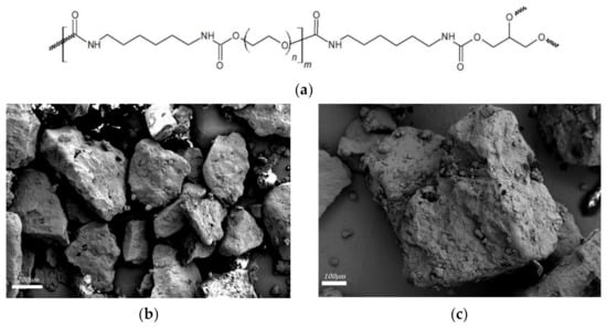 (a) Chemical structure of the homemade s/s PCMs PUX1520; (b,c) SEM images of s/s PCMs grains.