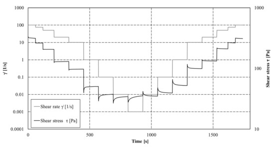 Rheological measurements were performed using a rheometer (Anton Paar MCR 102®) equipped with a four-bladed vane (Hv = 4 cm; Rv = 1.1 cm; Rc = 4.51 cm) and cylindrical cup. The temperature was controlled and fixed to 20 °C using a Peltier temperature control device located around the cup. Experiments were conducted with controlled shear rate measurements by applying first a restructuration protocol (shear rate decreasing) followed by a destructuration protocol (shear rate increasing). The retained shear rate values are given as follow: 100, 75, 50, 20, 10, 1, 0.1, 0.01, and 0.001 s−1. Each set point was fixed during at least 90 s to ensure the stabilisation of the shear stress value. Each suspension and solution was characterized at least twice to ensure the reliability of the measurements. For each step, shear stress (τ (Pa)) was measured each second and the steps last until a steady state. Mean shear stresses were obtained from these steady states and flow curves could then be analysed. An example of applied shear rates and measured shear stress is given in Figure 2.
