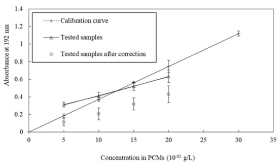 Samples with four different amounts of s/s PCMs (5, 10, 15 and 20 × 10−2 g·L−1) in cement paste were analysed. UV absorbance of their interstitial fluid is plotted in Figure 4 as a function of the initial content of s/s PCMs introduced in the cement paste. Linear regression (correlation coefficient = 0.999) of s/s PCMs/cement paste samples shows the –y-intercept different from zero. This implies that a correction must be applied to the absorption values of tested samples. This correction is required to compensate for the lack of water available to solubilize the s/s PCMs due to the competition between the cement hydration and the s/s PCMs solubilization. The intercept was subtracted from absorption values of the tested values thus giving corrected values.