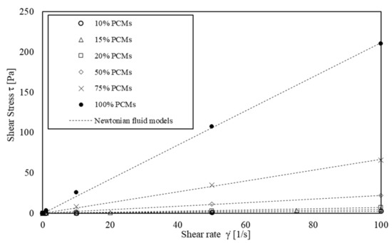 The rheological properties of six solutions of s/s PCMs and water (concentration ranging from 5.60 × 10−3 to 56.0 × 10−3 mol·L−1) were analysed. The average flow curves are shown in Figure 5. The rheological behaviour is well modelled by a Newtonian viscous law, Equation (4):