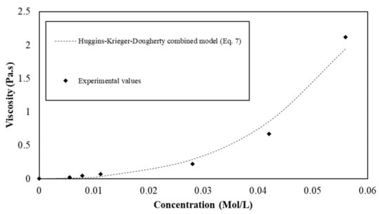 Kirincic and Klofutar [] reported values of [η] and k for PEG regarding the molar mass of the polymer. They found that molar mass values range from 1500 g·mol−1 to 35,000 g·mol−1 and values of [η] range from 11 to 2000 (L·mol−1). Since the s/s PCMs are mainly composed of PEG, it is assumed that the [η] must take its value in the same range. It is also reported that k generally takes its value between 0.3 and 0.5 [].