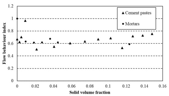 This law was used to describe flow curves of cement pastes and mortars and the parameters τ0, k and n were computed to fit the experimental values from rheological measurements. The flow behaviour index for cement pastes and mortars is plotted as a function of solid volume fraction (relative to s/s PCMs content) (Figure 7).