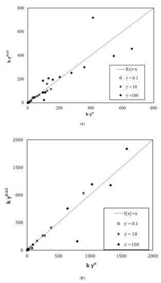 With τ, the shear stress (Pa); η, the viscosity (Pa·s) and , the shear rate (s−1). The best-fitting allows for modelling the experimental data with correlation coefficients higher than 0.99 (Figure 5).