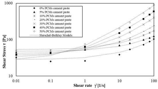 Shear flow curves of cement paste with amount of s/s PCMs ranging 0 wt% to 50 wt%.