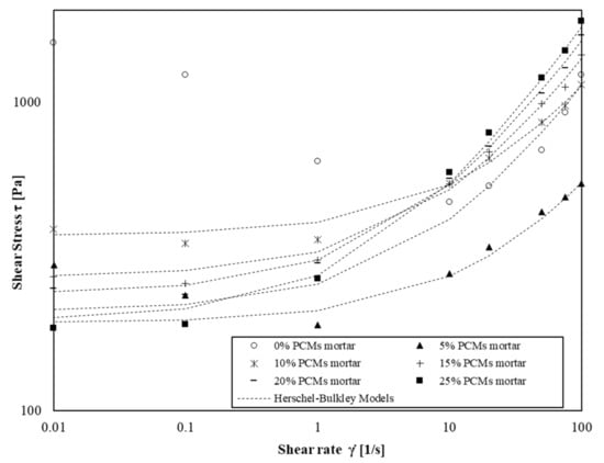 We observe that Herschel–Bulkley models fit the experimental values for the four shear rate decades except for mortars without and with a low amount of s/s PCM. In this case, the flow curves are only well modelled for shear rate values above 1 s−1. This phenomenon occurs particularly when there is no or low amount of s/s PCMs in mortars suspension. This result indicates that s/s PCMs could decrease the colloidal interactions of cement grains.