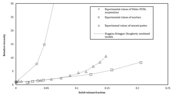 The relative viscosity evolution as a function of the solid volume fraction of s/s PCMs is shown in Figure 11 for the three distinct suspensions (mortar, cement and modified water). We observe from Figure 11 that the s/s PCMs have an influence on the relative viscosity of cement pastes and mortars. As observed previously, a structuration mechanism cannot be expressed only by the effect of solid inclusions. A combined Huggins and Krieger–Dougherty equation seems to be more appropriate to describe the evolution of the relative viscosity of a semi-soluble polymer solution. For cement pastes and mortars, cement and sand are implemented in the equation to compute the solid volume fraction. The relative viscosity is then described by the following Equation (9):
