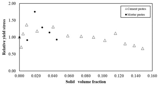 Figure 12 illustrates the relative yield stress versus the solid volume fraction of s/s PCMs in cementitious and mortar suspensions. In both cases and more specifically for cement pastes, yield stress values appear to be constant regardless of the content of s/s PCMs. This result differs from that generally reported in the literature. Indeed, increasing the quantity of solid inclusions generally leads to an increase in yield stress in an exponential law [,]. Here, the results suggest that a lubrication phenomenon acts in competition with the physico-chemical interactions that generate the yield stress.