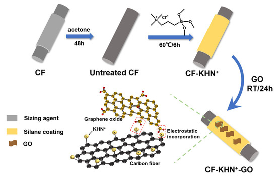 - Wen, Z.; Xu, C.; Qian, X.; Zhang, Y.; Wang, X.; Song, S.; Dai, M.; Zhang, C. A two-step carbon fiber surface treatment and its effect on the interfacial properties of CF/EP composites: The electrochemical oxidation followed by grafting of silane coupling agent. Appl. Surf. Sci. 2019, 486, 546–554. [Google Scholar] [CrossRef]