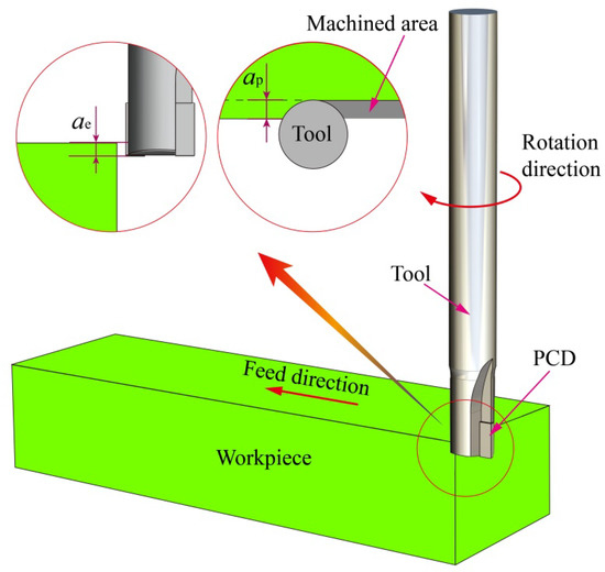 The physical properties of zirconia ceramics and PCD are shown in Table 2. The PCD tool is a second straight-tooth groove end mill with a diameter of 8 mm, helix angle and rake angle of 0°, and rear angle of 10°. The size of the zirconia ceramic is 100 × 30 × 20 mm3. The coefficient of friction is 0.3 incorporating a modified coulomb friction law with dry milling [24]. The zirconia ceramic and PCD are adopted an 8-node hexahedral element (C3D8RT) and 4-node tetrahedral unit (C3D4T), respectively. The milling schematic diagram is shown in Figure 1.