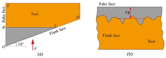 During zirconia ceramic milled by PCD tool, the large cutting force will intensify the friction between the tool and the workpiece contact surface leading to severe damage on the tool surface, especially flank face. The rake and flank angle of the PCD tool used in this research is 0° and 10°, respectively. The schematic illustration of tool wear is shown in Figure 2. EOD is the shape of the tool. After the tool wear, the shape of the tool is EBCD as shown in Figure 2a,b shows the A-direction view of the tool. VB is the average wear of the flank face. In order to simplify the measurement of tool wear, tool wear in this research was replaced by VB [25].