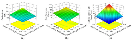 The influences of radial and axial depth of cut on the cutting force, tool flank wear and material removal rate are shown in Figure 5. Radial depth of cut increase caused a slight increase of cutting force and tool flank wear, mainly because the cutting distance becomes longer and the cutting amount increases when the axial depth of the tool contact remains unchanged. The contact area between the tool and the workpiece increased with the increase of axial depth of cut [26]. Therefore, the cutting force and tool flank wear increased more than increasing the radial depth of cut as shown in Figure 5a–c shows that the material removal rate increased significantly regardless of whether the radial or axial depth of cut increased. The interaction between radial and axial depth of cut has a significant impact on the material removal rate, followed by cutting force and tool flank wear.