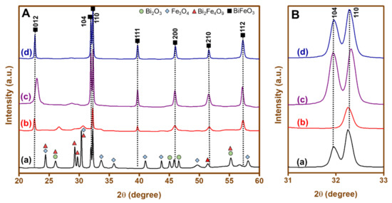 XRD pattern of (A) (a) BFO-C, (b) BFO-S, (c) BFO-L, and (d) BFO-M nanoparticles; (B) enlarged 2θ portion between 31°and 33°.