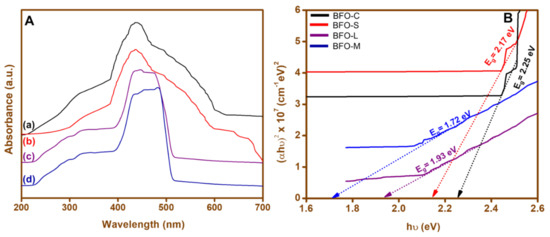The UV–vis absorption spectra of the BFO nanoparticles were recorded in the range of 200–700 nm at room temperature. Figure 2A shows the absorption spectra of the as-synthesized BFO nanoparticles of (a) BFO-C, (b) BFO-S, (c) BFO-L, and (d) BFO-M calcinated at 600 °C. The prepared nanoparticles showed maximum absorption in the region of 400–600 nm. The absorption maxima of BFO nanoparticles (a) BFO-C, (b) BFO-S, (c) BFO-L, and (d) BFO-M were found to be 436, 440, 482, and 504 nm, respectively, as shown in Figure 2A. The bandgap energy was determined with the Tauc model by plotting spectral dependence (αhν)2 over the incident photon energy hν, where α is the absorption coefficient given in Figure 2B. The figure illustrates the calculation of the bandgap energy (Eg) using the Tauc equation, (αh ν)n= C(h ν −Eg), where α is the absorption coefficient, h is Planck’s constant, ν is the light frequency, Eg is the bandgap energy, and C is a constant. The value of n was chosen as 2, which corresponded to a direct bandgap [51], while the value of α was calculated as follows. α = 2.303 × 103 ρA/lcM, where ρ is the theoretical density of BiFeO3 (8.22 g cm−3), A is the absorbance of the BiFeO3 nanocatalyst solution, l is the optical path length of the quartz cell (1 cm), c is the molar concentration of the suspension solution, and M is the molecular weight of the BiFeO3 nanocatalyst [52]. Different band gaps of 1.72, 1.93, 2.17, and 2.25 eV were calculated for BFO-M, BFO-L, BFO-S, and BFO-C, respectively, which might have been due to morphology and phase impurity. Moreover, these band gaps for BFO-C, BFO-S, BFO-L, and BFO-M were in the range previously reported for BiFeO3 (1.8–2.5 eV) [53,54].