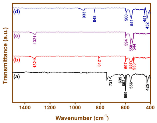 Figure 3 shows the FTIR spectra obtained for the BFO nanoparticles. Six characteristic peaks were observed in the BFO-C, five peaks were observed in the BFO-S, four peaks were observed in the BFO-L, and six peaks were observed in the BFO-M nanoparticle samples. The peaks in Figure 3a for BFO-C at the positions of 425 cm−1, 556 cm−1, 599 cm−1, and 602 cm−1 were due to stretching and bending vibrations of Fe-O bonds; and the peaks at 639 cm−1 and 721 cm−1 were due to Bi-O. In Figure 3b, the BFO-S showed peaks at 533 cm−1, 557 cm−1, and 597 cm−1 for (Fe-O), and at 1321 cm−1 for trapped nitrates. The characteristic peak at 812 cm−1 was due to Bi-O in BiFeO3 instead of Bi-O in Bi2O3, and matched with previously reported related work [55,56]. In Figure 3c, the BFO-L peaks at 544 cm−1, 558 cm−1, 594 cm−1, and 1321 cm−1 were assigned to Fe-O bending and stretching vibrations. In Figure 3d, for BFO-M only, the Fe-O peaks were found at 432 cm−1, 451 cm−1, 551 cm−1, and 560 cm−1, as well as a peak at 933 cm−1. The peaks at 451 cm−1 and 560 cm−1 were attributed to Fe–O stretching and O–Fe–O bending vibrations of FeO6 groups in perovskite BiFeO3, respectively, and were in agreement with the related literature [42]. We could compare our results with Ke et al., who reported that the peaks in the region of 400 to 600 cm−1 were the characteristics peaks for metal oxide that confirmed the synthesis of BFO [57].