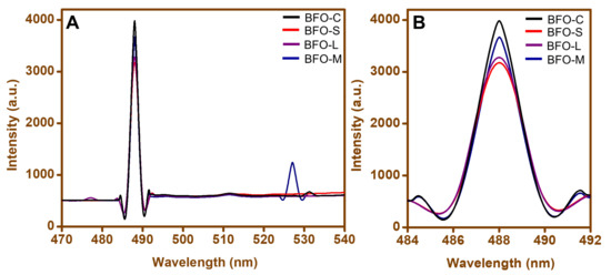 The PL emission spectra of the BFO nanoparticles were recorded at an excitation wavelength of 400 nm. In all the samples (BFO-C, BFO-S, BFO-L, and BFO-M), an emission peak appeared at 487 nm (Figure 4A), as reported by Gao et al. [58]. This phenomenon could be attributed to near-band-edge emission as a result of the radiative transition of photogenerated carriers (electrons–holes). An enlarged PL intensity around the 487 nm wavelength is portrayed in Figure 4B. The distinct intensities in emission peaks generated by BFO nanoparticles were attributed to the rate of recombination of photogenerated electron–hole pairs. In Figure 4A, the emission peak appeared at 527 nm for BFO-M. This smaller emission could be attributed to the presence of a shallow acceptor donor energy level below the conduction band. The shallow levels could have originated due to defects at the grain boundaries. The grain boundaries acted as a donor for electrons. Thus, charge separation enhanced the photocatalytic reaction caused by the lattice strain localized at the grain boundary.