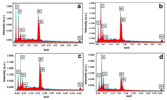 EDS micrograph of (a) BFO-C, (b) BFO-S, (c) BFO-L, and (d) BFO-M nanoparticles.