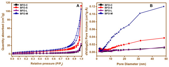 The N2 adsorption–desorption isotherm was measured for each BFO nanoparticle to investigate the effect on the Brunauer–Emmett–Teller specific surface area (BET-SSA) when using different fuels. The N2 adsorption–desorption isotherm and the pore size distribution for each BFO nanoparticle are represented in Figure 7. A type IV isotherm with a characteristic H3 hysteresis loop, mostly in the range of 0.8–1 (P/P0), was observed for all the samples (Figure 7A) [59]. The measurements of BET-SSA of 22.19, 16.21, 6.05, and 4.04 m2g−1 for BFO-M, BFO-S, BFO-L, and BFO-C nanoparticles, respectively, indicated the impact on the size of the BFO nanoparticles with the use of different fuels. It was evident from the SSA figures that the highest BET-SSA was calculated for the BFO-M nanoparticles, which were free from impure phases according to the XRD spectral data. The pore size distribution graph was estimated quantitatively with the use of the Barrett–Joyner–Halenda (BJH) method, as shown in Figure 7B [60]. As expected, the BFO-M nanoparticles exhibited a higher amount of pore distribution among all the BFO nanoparticles.