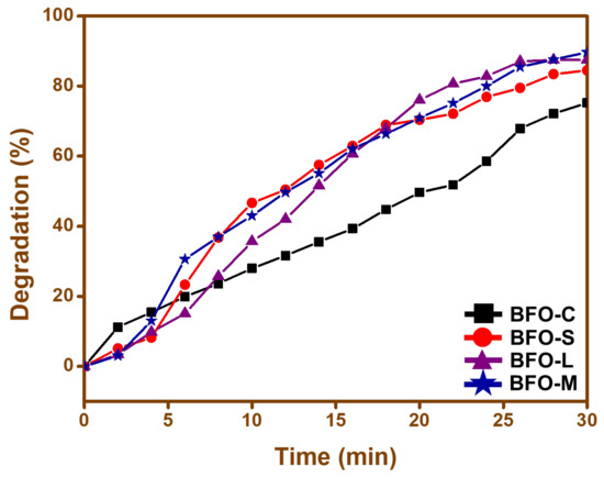 Photodegradation of cefixime trihydrate under sunlight was used to assess the photocatalytic activity of the synthesized BFO nanoparticles. The self-degradation seemed to be insignificant, as no cefixime trihydrate was broken down when a blank experiment was conducted for 30 min without using nanoparticles in the absence of sunlight. The degradation of cefixime trihydrate using the distinct BFO nanoparticles was plotted against time in Figure 8. All the BFO nanoparticles performed well as photocatalysts. However, the degradation efficiency was dissimilar for each photocatalyst prepared. As expected, the BFO-C nanoparticles exhibited the least activity towards the degradation, with a 75% degradation rate. The rest of the nanoparticles displayed a far better activity, with more than 80% drug degradation, as shown in Figure 8. The maximum removal efficiency of cefixime trihydrate was ~90% in half an hour by the BFO-M nanoparticles, while the previously reported removal efficiency was approximately similar, about ~90%, when using TiO2 nanoparticles. The removal efficiency of BFO nanoparticles was better than TiO2 nanoparticles [61]. The degradation mechanism for the BFO nanoparticles can be given as: