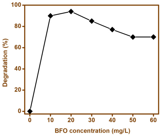 The effect of catalyst loading was evaluated by varying in the rage of 1060 mg while keeping the concentration of cefixime trihydrate (1 mg/L). An increase in the degradation rate was observed when the BFO-M was increased from 10 to 20 mg; however, with a further increase in the amount of the catalyst; i.e., BFO-M, the degradation rate was observed to decrease (Figure 10). This enhancement in the degradation rate with an increase in the amount of catalyst from 10 to 20 mg could be attributed to an increase in the active sites available. However, when the amount of catalyst was further increased, a reduction in the degradation of the antibiotic was observed, which could have been due to the deactivation of the activated complex, due to the contact with the ground level molecules, hence reducing the degradation of the antibiotic in the solution. Therefore, it was concluded that when 20 mg was used, the maximum degradation was achieved [65].