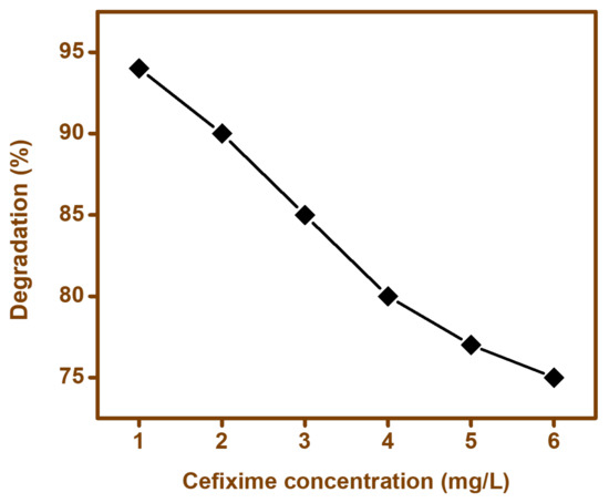 Figure 11 showed that a higher degradation rate was observed at a cefixime concentration of 1 mg/L. Cefixime was used in the range of 1 mg/L–6 mg/L. The results revealed that an increase in cefixime concentration led to a decrease in the degradation rate. It was assumed that when a solution with high concentration of contaminant was employed, a fraction of irradiated light might be absorbed by the contaminant molecules instead of the catalyst, which would result in a decrease in •OH and O2− generation, which in turn would lower the efficiency of the photocatalytic process. Additionally, the availability of the generated active species on the surface of catalysts was inadequate, as well as their probable blockage with the organic intermediates formed during the photocatalytic process, which may have resulted in a reduction in the photocatalytic degradation of the actual pollutant; i.e., cefixime trihydrate [66,67,68].