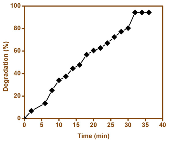 Contact time was an important factor that played a vital role in ensuring maximum efficiency of the photodegradation of the contaminant. In order to ascertain the optimum contact time for our catalyst; i.e., BFO-M, the degradation percentage for the contaminant was studied, and a sample was collected at different time intervals in order to study the degradation percentage (Figure 12). From the results obtained, we concluded that the cefixime degradation was faster during the initial 20 min of exposure time, after which the degradation efficiency reduced after 30 min, and it was then observed that no further degradation took place. Hence, it can be said that initially, cefixime was oxidized rapidly by the generated radicals; however, with passage of time, due to the formation of intermediates, the radicals generated were consumed, and the degradation efficiency was reduced [69].