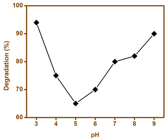 The degradation of pollutants is varied by the pH of the solution, hence the degradation of cefixime was studied under various pHs (Figure 13). From the results obtained, it was evident that the degradation catalyst; i.e., BFO-M, yielded a maximum degradation efficiency at pH = 3 (94%), and a similar degradation efficiency at pH = 9 (90%). When the pH was increased from 3 to 5, the degradation efficiency was reduced; however, when it was increased up to pH = 9, the degradation efficiency improved, and was similar to the one obtained when pH = 3. The variation in the degradation efficiency with varying pH could be attributed to the electrostatic interactions between BFO charged particles and the contaminants. The pH of solution had a significant role in determining the degree of dissociation of the pollutant. This point was related to the pKa value of the pollutant, which was considered to be 2.5 for cefixime [70]. Acid–alkaline properties of the BFOs’ surface can have significant effects on their photocatalytic function [71,72,73].