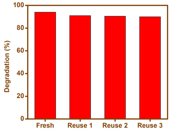 The reusability of the BFO-M was evaluated by cefixime trihydrate degradation under visible light for up to three cycles. After each reaction, BFO-M was removed from the liquid mixture, washed twice with deionized water, and finally dried at 80 °C. The degradation rates of recovered BFO-M were slightly less (91%, 90%, and 90.5%) than first-time use under optimized conditions (94%) (Figure 14). These close values indicated a good measure of stability, and suggested the reusability of the photocatalyst without significant losses in catalytic performance.
