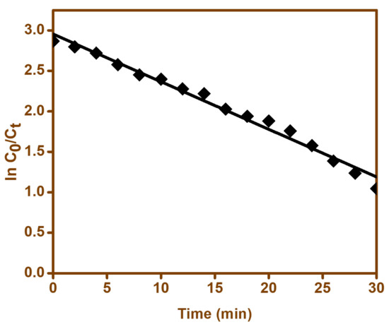 where C0 and Ct represent the cefixime concentration at the initial time and after specific time, t, respectively. A plot of ln(C0/Ct) versus irradiation time (Figure 15) gives a straight line with a slope of k. The regression analysis gave a correlation coefficient (R2) of 0.9838 for BFO, which displayed the good validity of the supposed first-order kinetics [74].