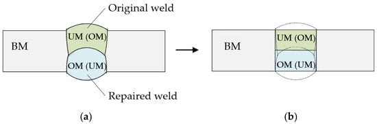 Like all structures, welded structures are susceptible to damage during use, particularly in the weld or heat-affected zone, due to the change in metal properties and the expected significant nonlinear deformations caused by mechanical heterogeneity. Repaired welds are commonly used in steel structures either to correct initial fabrication defects or to repair damage during service to extend the service life of the structure []. When welds are repaired, additional heterogeneity is introduced into the already heterogeneous structure.