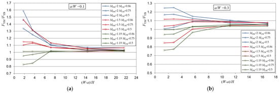Yield load solutions as a result of the analysis of a heterogeneous weld with a crack in the over-matched part of the weld in the function of weld slenderness (W − a)/H are presented in Figure 4.