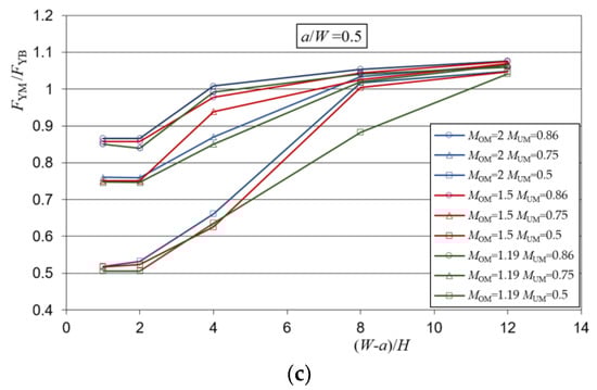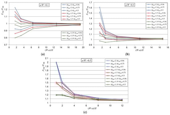 Mismatch yield loads for the heterogeneous weld and for a crack in the under-matched part of the weld: (a) shallow crack—a/W = 0.1; (b) medium length crack—a/W = 0.3; (c) deep crack—a/W = 0.5.
