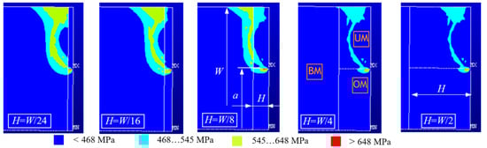 Figure 5 shows formation of the yield zone in a heterogeneous weld with a crack in the over-matched part of the weld for varying weld width H and constant crack length a/W = 0.5 for mismatch factors MOM = 1.19 and MUM = 0.86.