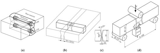 Tensile and fracture toughness specimens: (a) position and orientation of tensile specimens; (b) fracture toughness specimen notch orientation; (c) weld arrangement; (d) three point bending specimen SE(B) for fracture toughness testing.