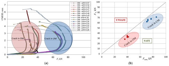 The plots of load versus CMOD were obtained and shown in Figure 8a. During fatigue pre-cracking in two specimens, with a notch in the OM part of the weld, a crack reached the fusion line between the OM and UM and advanced to the UM part of the weld (Figure 8a shown with dotted lines); therefore, they are omitted in later comparison with the yield load solutions for a heterogeneous weld. For every sample, a crack location (OM or UM) and initial crack length compared to the height of the specimen (a/W) is shown in the legend.