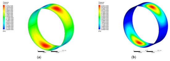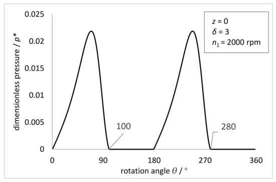 Figure 7 shows the dimensionless pressure distribution on the inner wall of the FS when the elliptical gap ratio is 3 and the rotational speed of the NFWG is 2000 rpm. The pressure presents a periodic distribution, and there are two periods between 0 and 2. The negative pressure is always being zero because of setting the pressure zero when the film pressure is lower than the atmospheric pressure.