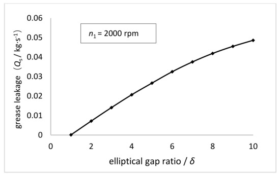 As shown in Figure 5, when the rotational speed of the NFWG is 2000 rpm, the variation curves of loading capacity, friction force, and friction factor on the inner wall of the FS are given as the increase of the elliptical gap ratio between the NFWG and the FS which is identified in Table 1. The elliptical gap ratio as an indicator is utilized to design the NFWG. Figure 6 shows the variation curve of the leakage of lubricating grease from both sides of the gap as the increase of the elliptical gap ratio. It can be seen that as the elliptical gap ratio increases, the leakage of grease also increases monotonically.