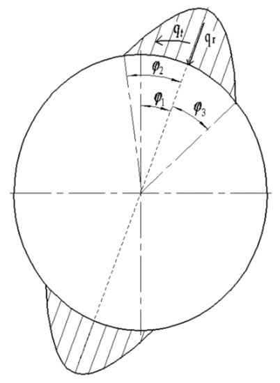 where qt is the circumferential uniform load, qr is the radial uniform load, α is the tooth profile angle, φ1 is the deflection angle of the load, which represents the deflection angle of the symmetry axis of the distributed load relative to the major axis of the wave generator, and φ2 is the left distribution angle of load, φ3 is the right distribution angle of the load [28].