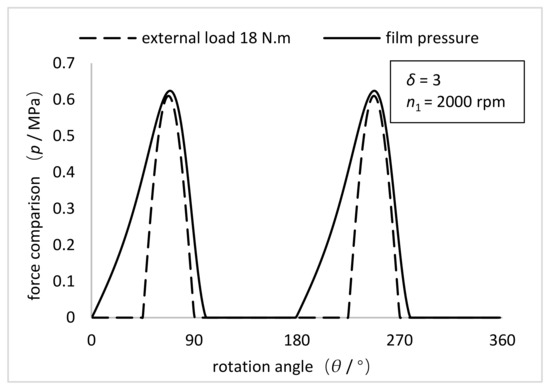 As shown in Figure 9, the comparison between the simulation results of pressure distribution of the oil film on the inner wall of the FS with the NFWG and the experimental results of external load distribution of the FS with the conventional FWG under the torque of 18 N·m is given. For HD, the stress in the FS depends on the load transmitted by the transmission, as well as the size of the meshing area and the distribution of loads in the meshing area. The radial load in meshing and the reaction force of the FWG are equal in magnitude but opposite in direction. Therefore, the pressure distribution represented by the dotted line in Figure 9 is equivalent to the force of the FWG on the entire circumference. The pressure distribution represented by the solid line in Figure 9 is the pressure distribution on the inner wall of the FS under the same size condition, which is equivalent to the force of the NFWG. Through comparison, it can be seen intuitively that the solid line wraps the dotted line, which proves that the novel HD with the NFWG can withstand a torque of 18 N·m under current condition. It verifies that the NFWG with optimal elliptical gap ratio in the HD can provide load and transmission under hydrodynamic lubrication with small friction factor, thereby reducing the wear of the FS and improving the lubrication performance.